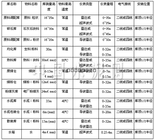 5.原煤倉和煤粉倉 三..庫和倉的物位的測量 1.物位測量綜述 水泥工業(yè)中主要是固體物料的物位測量,液位測量則很少。固體物料種類繁多,有塊料、顆粒狀、粉料,這些物料的介電常數(shù)、容重、溫度、水分含量也各不相同。接觸式測量是過去測量物位的主要手段,如電容式、重錘式、音叉式、阻旋式等測量方法,由于測量時儀表和物料是接觸的,在使用過程中往往會出現(xiàn)各種問題,如電容的掛料;重錘的斷錘、埋錘;音叉的堵料等,且日常的維護(hù)量很大。到20世紀(jì)90年代,水泥工業(yè)開始采用非接觸的物位測量,較早成熟的非接觸的測量技術(shù)有超聲波技術(shù)和核輻射技術(shù)(γ射線),核輻射技術(shù)因有放射源,在應(yīng)用上受到限制。 超聲波技術(shù)近幾年來發(fā)展很快,是目前應(yīng)用最廣泛的非接觸式測量方法,特別在液位測量。在水泥廠超聲波物位測量已較普遍應(yīng)用在原料調(diào)配庫、原煤庫、熟料庫等,但超聲波必須借助于媒質(zhì)傳播,如在水泥廠的儲庫物位測量通常以空氣作為傳播介質(zhì),而空氣的溫度、濕度、組分等的變化會影響超聲波傳播速度,空氣中的粉塵也將衰減超聲波的傳播信號;當(dāng)前超聲波物位測量僅用于測量塊料或顆粒狀的物料,對粉倉料位的測量,由于粉倉料位表面在下料時非常疏松,對超聲波信號有較強的衰減,故至今還沒有測粉倉料位成功的先例。 九十年代末期,在過程檢測領(lǐng)域出現(xiàn)了高性能、低價格的微波物位計即雷達(dá)料位計,所謂微波是電磁波,其頻率范圍為300MHz~300GHz, 微波的傳播速度為3x108 m/s, 如設(shè)頻率為5. 8GHz, 在大氣中波長約為52μm,其穿透力強,傳播速度不受粉塵、蒸汽及介質(zhì)組分的影響,傳播衰減也很?。粚Ρ粶y固體物料除要求其介電常數(shù)ε>1.8外,物料的溫度、壓力、密度等幾乎不影響對其準(zhǔn)確的測量;現(xiàn)有雷達(dá)料位計在天線設(shè)計和形狀確保了接受回波的能量;另外現(xiàn)場調(diào)試也十分簡單,通過專用的軟件,能把正確的回波迅速找到,并立即換算為物位值。由于比超聲料位計有其更卓越的性能,近幾年來,雷達(dá)料位計迅速、大量進(jìn)入了過程檢測儀表的市場,在各行業(yè)普遍使用。在水泥行業(yè)也幾乎由雷達(dá)料位計統(tǒng)占物位測量的領(lǐng)域,據(jù)統(tǒng)計近幾年來新設(shè)計的大型水泥廠和粉磨站的各類庫和倉近90%采用了各種類型的雷達(dá)料位計。 3.選型參照表