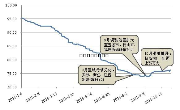 一、華東區(qū)域近期行情概述 從近三個月華東水泥的行情走勢來看,8月為全年行情的轉(zhuǎn)折點,8月華東總體行情出現(xiàn)積極變化,在安徽、江西、浙江等地調(diào)漲的支撐下區(qū)域行情筑底;進入9月上揚行情擴散至除山東、福建以外的五省市,從而使華東總體行情年內(nèi)首次反轉(zhuǎn)拉升;金秋10月期間,江西、安徽仍有良好上漲表現(xiàn),其余先前已上漲到位市場漲幅開始明顯收窄,福建部分市場僅限上漲風聲,山東市場行情頹勢不改。 從華東水泥價格指數(shù)來看,8月底價格指數(shù)為73.99,環(huán)比下降2.40%,降幅收窄,9月已環(huán)比攀升2.32%至75.71,10月漲幅收窄至0.69%,為76.23。至10月底,華東水泥價格低于去年同期65元/噸,價格差環(huán)比進一步拉大。 圖1:年內(nèi)華東地區(qū)水泥價格指數(shù)走勢