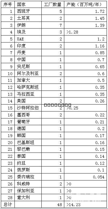 白水泥是一種可以替代灰水泥的增值產(chǎn)品,其熱反射性能和更美的外觀都優(yōu)于灰水泥。白水泥的生產(chǎn)方式與灰水泥相似,但是石灰石原料中氧化鐵和硫酸鐵含量要盡可能低。每增加0.1%的氧化鐵,將降低2.5%的熱反射率,并將產(chǎn)生顏色較暗的水泥。礦化劑和高溫可以確保氧化鐵缺乏的情況下原料的充分反應(yīng),而這需要更多的燃料。此外,白水泥熟料必須迅速冷卻,經(jīng)常用的冷卻方法是水冷卻,以防微量鐵雜志氧化使水泥顏色變深。這些因素使得白水泥生產(chǎn)成本更高。 炎熱氣候的國家白水泥的需求量比較高,與標(biāo)準灰色混凝土相比白色混凝土表面可以反映出更多熱量。在發(fā)達經(jīng)濟體,白水泥越來越受歡迎,它經(jīng)常用于創(chuàng)新型建筑和標(biāo)志性建筑的建設(shè)。作為一種增值產(chǎn)品,其出口距離要更遠一些,這就意味著產(chǎn)量不受國內(nèi)需求量的制約。2015年,世界上最大的白水泥生產(chǎn)國是西班牙,白水泥生產(chǎn)線有5條,產(chǎn)能合計172萬噸/年。土耳其、伊朗、埃及、阿聯(lián)酋和印度白水泥產(chǎn)能也超過100萬噸/年。 表1:全球各國白水泥產(chǎn)能情況