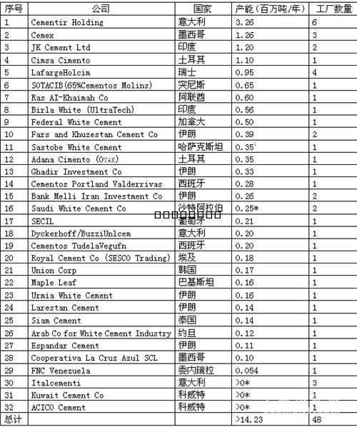 注:白水泥產(chǎn)能集中在北非和中東地區(qū),還有一些分布在北美、印度和歐洲。 白水泥生產(chǎn)企業(yè) 2015年跨國白水泥企業(yè)有32個,共有48個水泥廠,分布在28個國家。這些企業(yè)的白水泥產(chǎn)能總計有1420萬噸/年(見表2)。這個統(tǒng)計數(shù)據(jù)不包括7個雙線企業(yè),這些企業(yè)只統(tǒng)計了灰水泥產(chǎn)能或綜合水泥產(chǎn)能。該數(shù)據(jù)也不包括單獨粉磨站生產(chǎn)的白水泥產(chǎn)能。 表2: 全球白水泥生產(chǎn)企業(yè)分布及產(chǎn)能情況