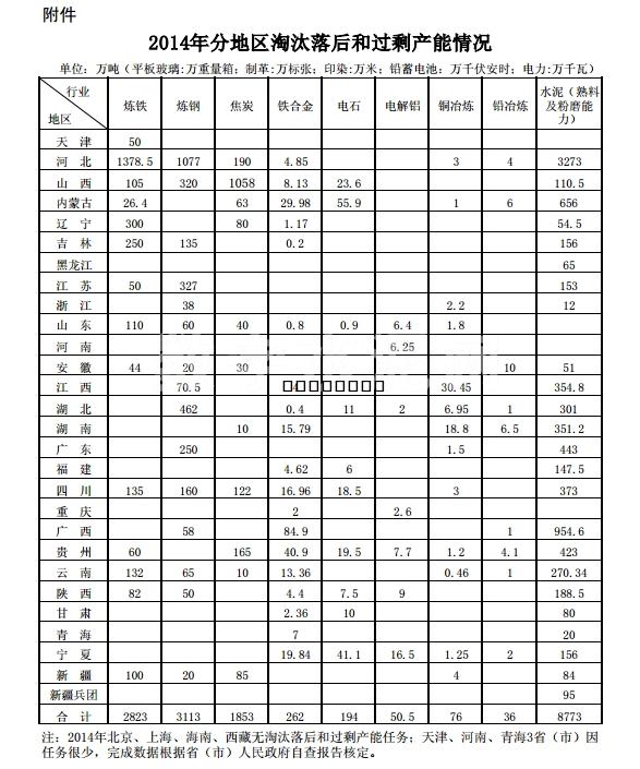 安徽省鋼鐵行業(yè)、江西省煤炭和稀土行業(yè)、山東省煤炭行業(yè)未完成2014年淘汰落后和過剩產(chǎn)能任務(wù),其余地區(qū)均完成或超額完成年度任務(wù)。