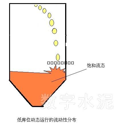 動(dòng)態(tài)運(yùn)行中總料重 由庫(kù)底壁平均支撐,庫(kù)底出口壓力較高。 3、進(jìn)量等于出量 此情況下實(shí)現(xiàn)了進(jìn)出的動(dòng)態(tài)平衡,庫(kù)料位與流動(dòng)性將保持不變。高庫(kù)位時(shí),庫(kù)底流動(dòng)性較低,中庫(kù)位時(shí)流動(dòng)性居中,低庫(kù)位時(shí)則因高落差進(jìn)料沖擊易造成全激發(fā)為高壓全液化料,使庫(kù)底出口處粉料壓力必然上升到最高,易導(dǎo)致出料流量猛增而失控沖出。 根據(jù)以上分析,為了獲得穩(wěn)定的流動(dòng)性和控制特性,顯然,在生產(chǎn)過(guò)程中應(yīng)盡可能選擇3,且保持庫(kù)位在中部,所以在實(shí)際連續(xù)生產(chǎn)中應(yīng)根據(jù)工藝的最佳出料流量設(shè)計(jì)選擇稍大的進(jìn)料量,而不是較大的冗余進(jìn)量匹配。 九、粉庫(kù)運(yùn)行的不同實(shí)際工作方式 1、同時(shí)連續(xù)進(jìn)料和卸料方式 粉料從前道工序持續(xù)輸送來(lái)(如粉磨),經(jīng)提升機(jī)從頂部打入庫(kù)內(nèi),而庫(kù)底保持定流量出料,如此形成了持續(xù)動(dòng)態(tài)運(yùn)行的情況。其中:進(jìn)料與出料流量大體相等,宜保持在中倉(cāng)位。 2、周期性快速進(jìn)料和連續(xù)慢卸料方式 實(shí)際生產(chǎn)中常存在這樣的工況:粉料從遠(yuǎn)處用罐車運(yùn)送來(lái),快速?gòu)捻敳勘萌霂?kù)內(nèi),而庫(kù)底保持持續(xù)定流量出料;或者前道工序(如粉磨)匹配的供料量偏大, 庫(kù)滿后必然停止進(jìn)料較長(zhǎng)時(shí)間,此后時(shí)庫(kù)底保持靜態(tài)流量出料,等料空庫(kù)位較低時(shí)再進(jìn)料,如此形成了周期性動(dòng)態(tài)與靜態(tài)運(yùn)行的交替情況。其中: 動(dòng)態(tài)情況往往在料 空庫(kù)位較低時(shí)進(jìn)行,剛進(jìn)料階段易處于最危險(xiǎn)的全激發(fā)高壓狀態(tài),極易對(duì)出料控制產(chǎn)生沖擊波動(dòng)干擾;庫(kù)位升高到一定位置后才會(huì)使庫(kù)底流動(dòng)性逐步下降穩(wěn)定,直到庫(kù)內(nèi)灌滿。