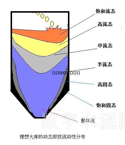 3、復(fù)雜方式 其中,2、3方式因庫(kù)內(nèi)底部存在大量管路,長(zhǎng)期運(yùn)行后空氣中水份在氣粉接合部會(huì)產(chǎn)生水凝結(jié)沉積板結(jié),累積形成水硬性阻塞,最后必須徹底停產(chǎn)進(jìn)行人工清除維護(hù)。另外,由于需持續(xù)通電吹氣以維持穩(wěn)定的流動(dòng)性,卸料運(yùn)行能耗很高。再者,2、3方式處于中高庫(kù)位工作時(shí),其大庫(kù)底部料的流動(dòng)性必然處于 級(jí)別5或4的高固態(tài),強(qiáng)制吹入空氣后不易形成穩(wěn)定的飽和流態(tài),且必然吹空庫(kù)底排氣口局部空間形成空洞群,最終在大庫(kù)底部?jī)?nèi)必然形成不規(guī)則周期性空洞垮塌性下陷沖擊,進(jìn)一步擴(kuò)大出料波動(dòng)性。 十一、理想的動(dòng)態(tài)下卸時(shí)流動(dòng)性分布與力學(xué)傳導(dǎo)特征 根據(jù)上述分析,顯然理想的卸料系統(tǒng)的流動(dòng)性特征目標(biāo)應(yīng)如下: 1、從進(jìn)料到出料要全面合理的動(dòng)態(tài)平衡料容(料位)位設(shè)計(jì)范圍,避免共用同一庫(kù)進(jìn)行大范圍的供料流量切換。 2、流動(dòng)性保持在2、3的中間級(jí)別時(shí),即半流態(tài)和中流態(tài)時(shí)對(duì)后續(xù)控制有利,要有目的地防止流動(dòng)性向過(guò)低(0、1級(jí)別)和過(guò)高(4、5級(jí)別)方向發(fā)展變化,如此使內(nèi)部有利于整體流的形成,從而對(duì)卸料裝置的穩(wěn)定控制特性有利。 3、應(yīng)根據(jù)工作流量和工作方式來(lái)設(shè)計(jì)合理的庫(kù)容尺寸,盡可能使生產(chǎn)時(shí)的庫(kù)位動(dòng)態(tài)變化范圍處于有利的條件下。