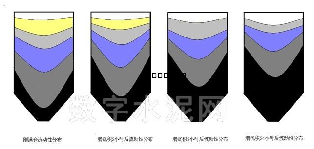 實(shí)際含氣量的變化是連續(xù)的,作以上6級(jí)分類主要用于分析庫(kù)內(nèi)基本的傳導(dǎo)力學(xué)的作用特性。 粉料中某點(diǎn)(處)的變向擴(kuò)張壓力傳導(dǎo)性為: P=p* sinα 其中 p為該處的上部料壓,一般與該處垂直料位深度成正比。 α為粉料的流動(dòng)系數(shù)自然流動(dòng)角,與含氣量(空氣或外加其他氣體)成正比。 顯然,流動(dòng)性大者的變向擴(kuò)張壓力自然上升,在飽和流態(tài)時(shí)等同于液態(tài)的全擴(kuò)張?zhí)匦?,其繞流性極高,故易形成垂直方向重力增壓沖料失控。反之,在飽和固態(tài)時(shí)接近于固體的零擴(kuò)張?zhí)匦?,其饒流性極低,對(duì)邊壁的拱架支撐率大幅提升,從而易形成垂直方向重力減壓滯料失控。 五、粉體的動(dòng)態(tài)平衡關(guān)系 當(dāng)粉體下卸運(yùn)行中,料的垂直下移速度與料內(nèi)含氣的上逸速度會(huì)形成以下3種情況: 1、料下移速大于其含氣上逸速 此情況下庫(kù)料流動(dòng)性將日益增大,最終達(dá)到兩者相同的較高流動(dòng)性,實(shí)現(xiàn)了新的動(dòng)態(tài)平衡。結(jié)果表明粉料越動(dòng)越軟。 2、料下移速小于其含氣上逸速 此情況下庫(kù)料流動(dòng)性將日益減弱,最終達(dá)到最低流動(dòng)性,結(jié)果表明粉料越不動(dòng)越易變硬。 3、料下移速等于其含氣上逸速 此情況下實(shí)現(xiàn)了動(dòng)態(tài)平衡,庫(kù)料流動(dòng)性將保持不變,結(jié)果表明粉料平衡時(shí)穩(wěn)定性最好。 根據(jù)以上分析,顯然在料庫(kù)容積與流量的動(dòng)態(tài)關(guān)系中存在一定的設(shè)計(jì)邊界,流量小者庫(kù)直徑與庫(kù)高度(庫(kù)容)不宜過(guò)大,否則庫(kù)底出口處的流動(dòng)性變低易拱塞;流量大者則庫(kù)直徑與庫(kù)高度(庫(kù)容)不宜過(guò)小,否則庫(kù)底出口處的流動(dòng)性變高易擴(kuò)大其壓力波動(dòng)性。所以在實(shí)際生產(chǎn)中應(yīng)根據(jù)工藝的最佳流量設(shè)計(jì)選擇合理的料庫(kù)的尺寸容量,而不應(yīng)錯(cuò)位選配。 六、粉庫(kù)滿倉(cāng)靜態(tài)沉積隨時(shí)間的流動(dòng)性分布與變化