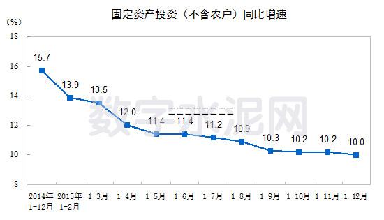 2015年,全國(guó)固定資產(chǎn)投資(不含農(nóng)戶(hù))551,590億元,比上年名義增長(zhǎng)10%(扣除價(jià)格因素,實(shí)際增長(zhǎng)12%),增速比1-11月份回落0.2個(gè)百分點(diǎn)。從環(huán)比速度看,12月份固定資產(chǎn)投資(不含農(nóng)戶(hù))增長(zhǎng)0.68%。