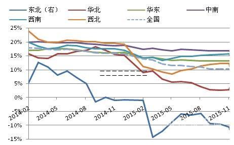 2015年內(nèi)固定資產(chǎn)投資增幅的大幅度減弱以及投資結(jié)構(gòu)的調(diào)整,直接削弱了水泥需求的動(dòng)能。2015年,固定資產(chǎn)投資完成額累計(jì)同比增速逐月下滑,全年累計(jì)同比增長(zhǎng)10%,較上年跌落5.7個(gè)百分點(diǎn),更創(chuàng)下2000年6月以來(lái)的最低水平。年內(nèi)新開(kāi)工項(xiàng)目計(jì)劃總投資同比僅增長(zhǎng)5.5%,較上年同期下降8.1個(gè)百分點(diǎn)。特別是億元以上新開(kāi)工項(xiàng)目計(jì)劃總投資同比增速更低,新開(kāi)工大項(xiàng)目不足問(wèn)題比較突出。主要是由于地方政府受到融資平臺(tái)清理、房地產(chǎn)市場(chǎng)不景氣及經(jīng)濟(jì)增速下降導(dǎo)致財(cái)政收入增速下降等多方面因素的影響,部分項(xiàng)目尤其是大項(xiàng)目的資金來(lái)源受限,致使部分穩(wěn)增長(zhǎng)措施難以落地。 圖1:2015年南部地區(qū)投資勉力支撐,華北、東北已“淪陷”(%)