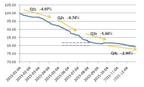 數(shù)據(jù)來(lái)源:國(guó)家統(tǒng)計(jì)局 3.2、市場(chǎng)恐慌情緒引致水泥價(jià)格一路走低 2015年,中國(guó)水泥價(jià)格指數(shù)(CEMPI)從年初的99.8點(diǎn)下跌至年末的79.25點(diǎn),累計(jì)跌幅達(dá)20.59%,較2014年跌幅進(jìn)一步加深。年內(nèi),水泥價(jià)格除在九月底至十月中旬有所反彈外,其余時(shí)間基本呈單邊下跌走勢(shì)。分季度看,各季度水泥價(jià)格均有不同程度的下跌,其中二季度跌幅最大,達(dá)到了8.74%,四季度屬于水泥銷售旺季,然而市場(chǎng)表現(xiàn)乏力,水泥價(jià)格也下跌了2.94%。 圖3:2015年中國(guó)水泥價(jià)格指數(shù)走勢(shì)