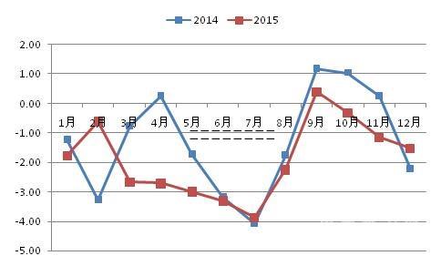 數(shù)據(jù)來(lái)源:中國(guó)水泥研究院 從各月份的表現(xiàn)看,2015年各月份的價(jià)格行情普遍弱于2014年同期。例如,2014年3月份水泥價(jià)格跌幅縮窄,4月份則出現(xiàn)了小幅反彈,而2015年由于市場(chǎng)啟動(dòng)緩慢,3~7月份水泥價(jià)格跌幅不僅沒(méi)有縮窄的跡象,反而逐月加大,同時(shí)更沒(méi)有出現(xiàn)預(yù)期的小旺季,9月傳統(tǒng)旺季來(lái)臨時(shí)反彈同樣不及2014年同期,10月雨水及高庫(kù)存使得價(jià)格重新回歸跌勢(shì),11、12月價(jià)格更是早早敗退。 圖4:2014與2015年各月份價(jià)格指數(shù)變動(dòng)幅度走勢(shì)(%)