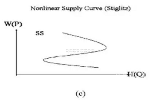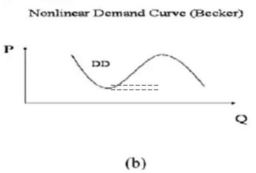圖1:線性和非線性的供求曲線,對(duì)應(yīng)自穩(wěn)定和非穩(wěn)定的市場(chǎng)機(jī)制。 新古典經(jīng)濟(jì)學(xué)給出的自穩(wěn)定的市場(chǎng)機(jī)制:需求曲線DD斜率為負(fù),供給曲線SS斜率為正。兩者只有一個(gè)交點(diǎn)即市場(chǎng)的均衡態(tài)。條件是需求方是“理性人”能做獨(dú)立的優(yōu)化判斷,規(guī)避風(fēng)險(xiǎn),不受他人影響。供給方滿足規(guī)模報(bào)酬遞減或不變,只求利潤(rùn)最大化,不追逐市場(chǎng)份額。