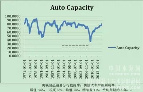 美國(guó)汽車制造業(yè)的產(chǎn)能過剩的變動(dòng)幅度,比鋼鐵業(yè)還要嚴(yán)重。設(shè)備利用率在36-95% 大幅擺動(dòng)。平均周期為5.5年。