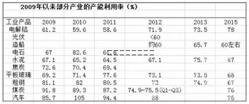 來(lái)自中國(guó)金融四十人論壇(CF40)內(nèi)部課題“我國(guó)產(chǎn)能過剩風(fēng)險(xiǎn)評(píng)估與化解”的部分成果,左邊數(shù)值為工業(yè)產(chǎn)能利用率。 2009年以來(lái)中國(guó)部分行業(yè)產(chǎn)能利用率。其中2013年,粗鋼、水泥、平板玻璃、電解鋁、造船等行業(yè)被列為嚴(yán)重產(chǎn)能過剩行業(yè)。空格為信息缺失。
