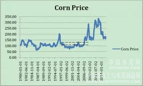 玉米的價(jià)格波動(dòng)更為頻繁。2004年10月為93.37, 2008年6月升到267.11,4年不到漲了近2倍;到2009年9月跌到150.57,一年多跌去44%;2012年7月回升到332.95,3年漲了1.2倍;2015年8月跌到162.74,3年跌去過半。