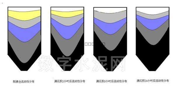3、復(fù)雜方式 其中,2、3方式因庫內(nèi)底部存在大量管路,長期運行后空氣中水份在氣粉接合部會產(chǎn)生水凝結(jié)沉積板結(jié),累積形成水硬性阻塞,最后必須徹底停產(chǎn)進(jìn)行人工清除維護(hù)。另外,由于需持續(xù)通電吹氣以維持穩(wěn)定的流動性,卸料運行能耗很高。再者,2、3方式處于中高庫位工作時,其大庫底部料的流動性必然處于級別5或4的高固態(tài),強(qiáng)制吹入空氣后不易形成穩(wěn)定的飽和流態(tài),且必然吹空庫底排氣口局部空間形成空洞群,最終在大庫底部內(nèi)必然形成不規(guī)則周期性空洞垮塌性下陷沖擊,進(jìn)一步擴(kuò)大出料波動性。 十一、理想的動態(tài)下卸時流動性分布與力學(xué)傳導(dǎo)特征 根據(jù)上述分析,顯然理想的卸料系統(tǒng)的流動性特征目標(biāo)應(yīng)如下: 1、從進(jìn)料到出料要全面合理的動態(tài)平衡料容(料位)位設(shè)計范圍,避免共用同一庫進(jìn)行大范圍的供料流量切換。 2、流動性保持在2、3的中間級別時,即半流態(tài)和中流態(tài)時對后續(xù)控制有利,要有目的地防止流動性向過低(0、1級別)和過高(4、5級別)方向發(fā)展變化,如此使內(nèi)部有利于整體流的形成,從而對卸料裝置的穩(wěn)定控制特性有利。 3、應(yīng)根據(jù)工作流量和工作方式來設(shè)計合理的庫容尺寸,盡可能使生產(chǎn)時的庫位動態(tài)變化范圍處于有利的條件下。