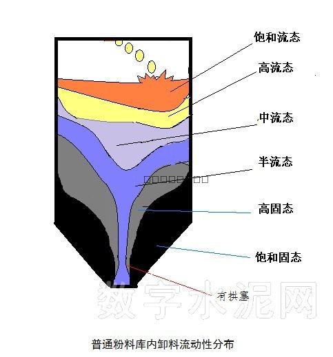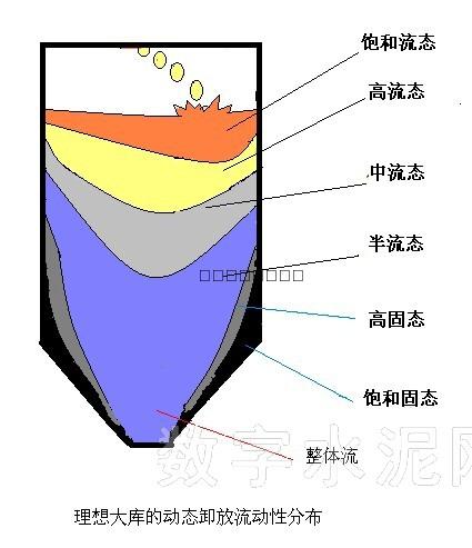 鋼板庫庫內(nèi)料重力分布依庫底流動性不同而不同,長期靜態(tài)沉積后形成硬性喇叭型分層固態(tài)過渡,總應(yīng)力為“V”型杯托支撐分布,總料重大部分由庫低環(huán)錐壁垂直支撐,而庫底壁水平外張力不高,出口壓力很低(一般僅在10kpa 以下)。 鋼板倉滿倉飽和沉積后的卸放,因鋼板庫庫底已形成流動性最低的飽和固態(tài),極易產(chǎn)生拱架阻塞,出料量越大越易拱塞斷料。 鋼板倉中倉飽和沉積后的靜態(tài)卸放,因庫底已形成流動性較低的高密度固態(tài),也易產(chǎn)生拱塞瓶頸限流或斷料。 鋼板倉低倉飽和沉積后的靜態(tài)卸放,因庫底壓力不大,其流動性尚達(dá)不到極低的飽和固態(tài),卸放過程要平順些。 七、粉庫自然動態(tài)卸放時的流動性分布與力學(xué)傳導(dǎo)特征 當(dāng)粉體庫底卸出運行同時鋼板庫庫頂進(jìn)料時,我們稱為動態(tài)運行。普通大庫的典型動態(tài)運行時的流動性分布如下圖 :