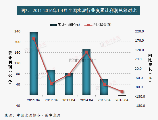 2016年4月,全國水泥市場(chǎng)需求穩(wěn)定增長,水泥價(jià)格持續(xù)回升,行業(yè)盈利情況出現(xiàn)好轉(zhuǎn),但前4個(gè)月全行業(yè)仍處于虧損狀態(tài)。