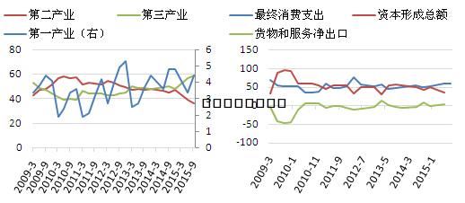 2015年前三季度,全國經(jīng)濟(jì)增速逐步放緩的趨勢越來越明顯,GDP從第一季度和第二季度的7.0%跌至第三季度的6.9%,盡管從數(shù)據(jù)變化來看變化幅度很小,但從不同產(chǎn)業(yè)及拉動(dòng)經(jīng)濟(jì)增長的結(jié)構(gòu)來看,中國經(jīng)濟(jì)發(fā)展方式已經(jīng)出現(xiàn)了較為明顯的轉(zhuǎn)變。 圖1:中國經(jīng)濟(jì)發(fā)展方式及產(chǎn)業(yè)結(jié)構(gòu)出現(xiàn)明顯轉(zhuǎn)變